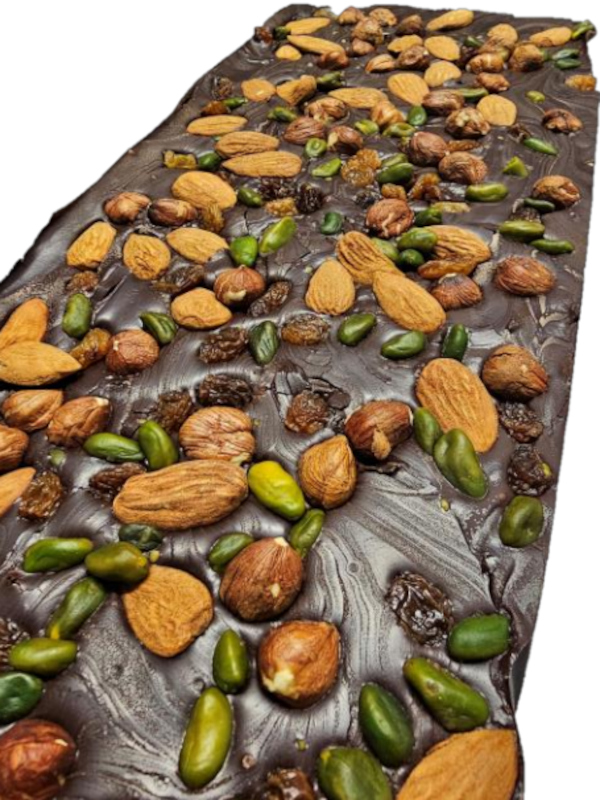 chocolat lait 39% (beurre de cacao, lait en poudre, extrait de vanille et sucre) , noisettes, raisins secs, pistache, amandes